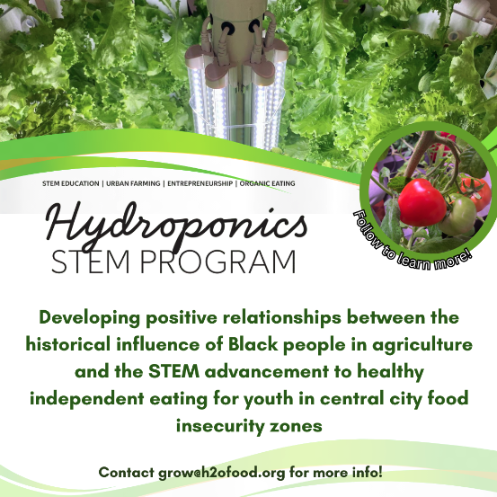 The Hydroponics STEM Program's mission is “to serve as an instrument for developing a positive relationship between the historical influence of Black people in agriculture and the STEM advancement to healthy independent eating; impacting youth in food insecure zones.” Our vision is to provide a sense of pride in their history, curate a healthy eating environment, and explore opportunities.